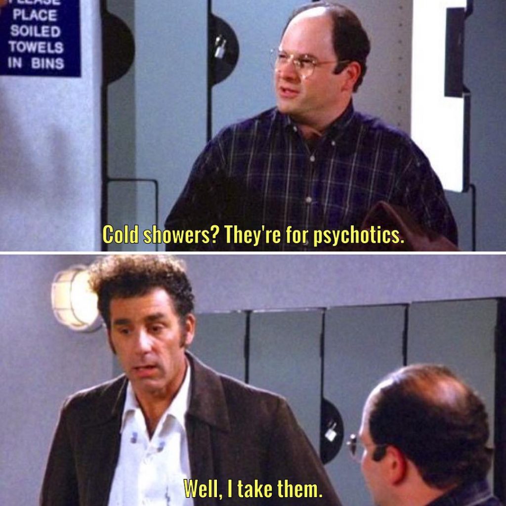 George glares at Kramer, “Cold showers? They’re for psychotics”. Kramer responds, “Well, I take them.”