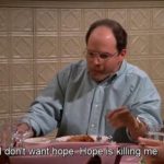 Jerry’s main friends are George Costanza, Cosmo Kramer and his ex-girlfriend Elaine Benes. Jerry (though not without exceptions) typically represents the voice of reason amidst George, Elaine, and Kramer’s antics, and can be seen as the focal point of the foursome’s relationship. Jerry is the only main character on the show to maintain the same career throughout the series (except for the episode where he is forced into bootlegging). Considering his job as a comedian, he is the most observational character, usually sarcastically commenting on his friends’ quirky habits, almost essentially the “New York Jew”-type character. He seems to have a new girlfriend every week, but the relationships usually end for fairly superficial reasons. He is also an almost obsessive compulsive neat freak.
